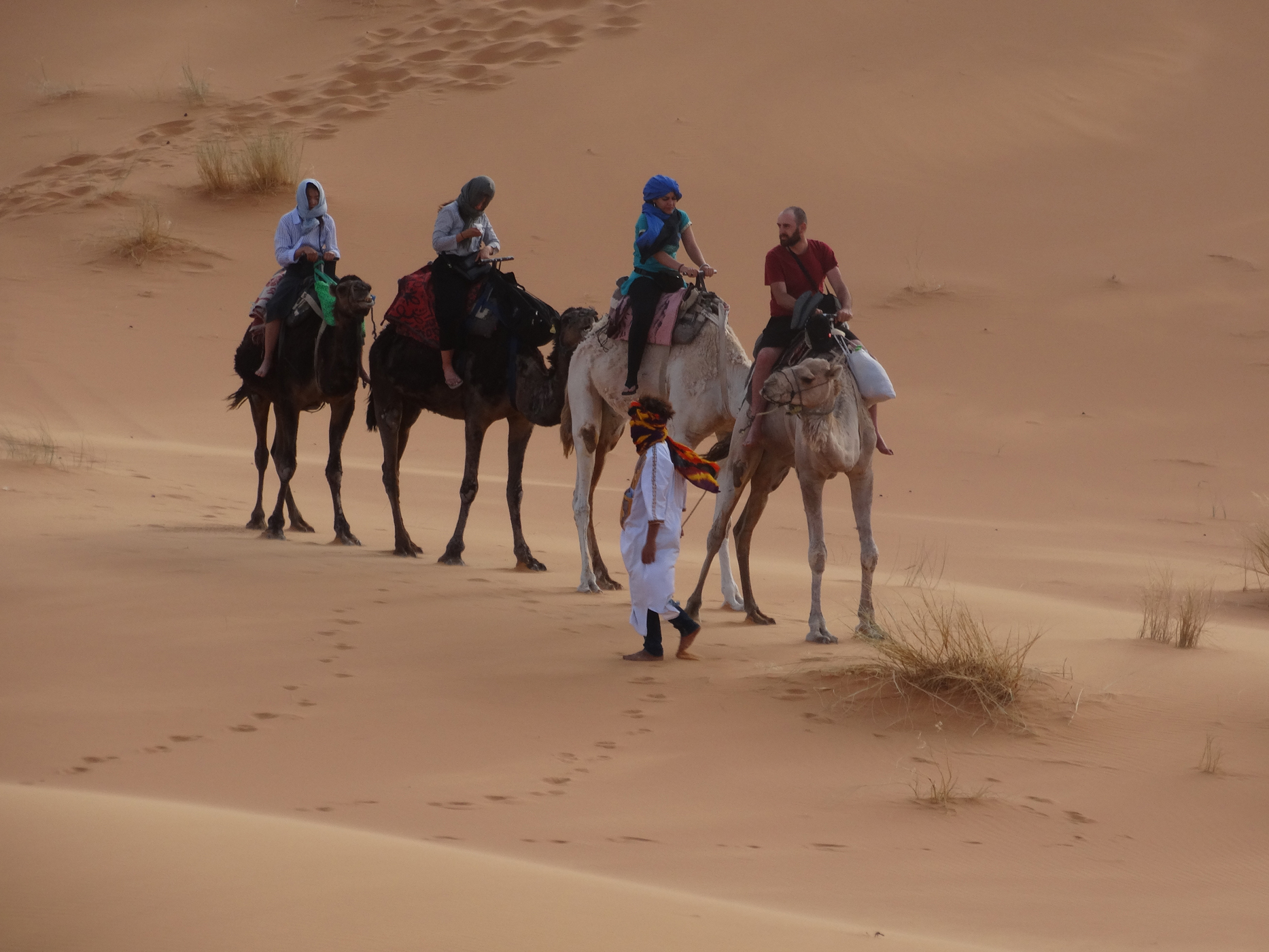 Recorrido alrededor de las dunas, pasando por muchos lugares importantes del desierto. Uno de ellos es el pueblo de Khamlia, donde pararéis para disfrutar de la música Gnawa y luego continuaremos el camino de los nómadas bereberes del desierto hasta sus haimas, donde descubriréis un nuevo sentido de la vida. Visitaremos también las minas del [kohl] y las minas de los fósiles. Por la tarde, tomaremos los camellos para llegar al campamento, donde cenaremos y pasaremos la noche en medio de las dunas bajo un haima nómada bereber.